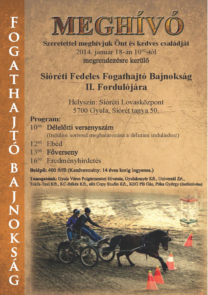 Ismét fogathajtó randevú volt Gyulán, a Sióréti Lovascentrumban január 18-án, ahol a fedeles bajnokság második fordulóját tartották. A decemberi első forduló sikere nyomán mind a nevezők száma, mind a nézőközönség létszáma nőtt.