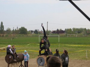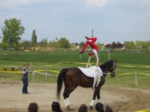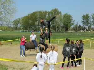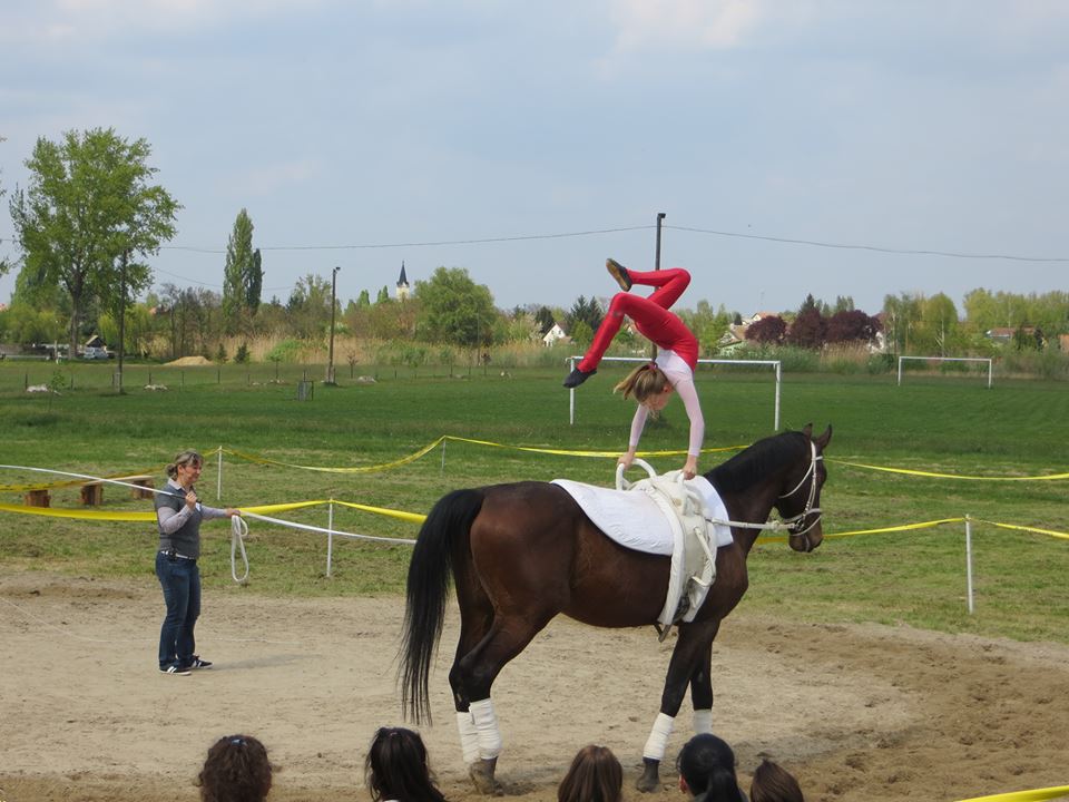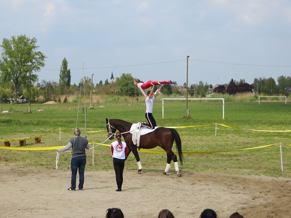 Ezután két műló jutott szerephez, hiszen az elméletben megismert kötelező gyakorlatok bemutatására kért bátor jelentkezőket, majd a gyakorlatok kapcsán kitért a hibák javításra, a helyes technikák elsajátítására. A füzesgyarmati lovastornászok, majd a békéscsabai Nimród LE apróságai folyamatosan jelentkeztek egy-egy elem bemutatására. A műlovas edzést az ebédszünet szakította meg, mindenki megkóstolta a babgulyást, amiben a szakácsok ,,szívén” túl a szentandrási házikolbász is benne volt.