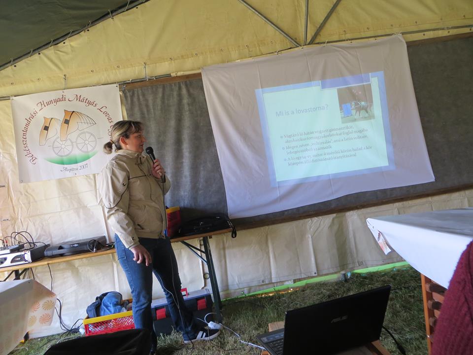 Ezt követően Villányi Krisztina, a Magyar Lovas Szövetség lovastorna szakágának szövetségi kapitánya kapta meg a mikrofont. Bemutatkozását azzal kezdte, hogy egykor ő is ebben a szakágban versenyzett, de talán sikeresebb edzőként, mint egykor versenyzőként. Kaposváron 14 éve foglalkozik a sportággal, ezidő alatt válogatott versenyzőket nevelt, most is elkísérte őt két tanítványa, Bence Balázs országos bajnok, EB 7. helyezett és Szabó Kitti, akik segítségére voltak a gyakorlati edzés során. Hiszen két részre osztotta a nap programját, délelőtt diavetítéssel egybekötött előadást tartott a lovastorna ,,hozzávalóiról” (ló, kikötő, alátét, szivacs, heveder, ostor, műló), szólt a lovastornászokról, a sportág helyzetéről. Részletesen bemutatta a kötelező gyakorlatokat, annak bírálatát, így a jelenlévők megismerhették a felugrás, alapülés, zászló, malom, olló, állás, leugrás követelményeit, az adható pontok és levonások mértékét. Bemutatta a versenykategóriákat (műlovas verseny, utánpótlás verseny, stb), a kűrök összeállításának követelményeit, annak bírálati szempontjait. Érdekes felvételeket vetített a lovastorna nemzetközi és hazai versenyzők által bemutatott gyakorlatokról, ezek magyarázatával még több információt osztott meg a szakágról.