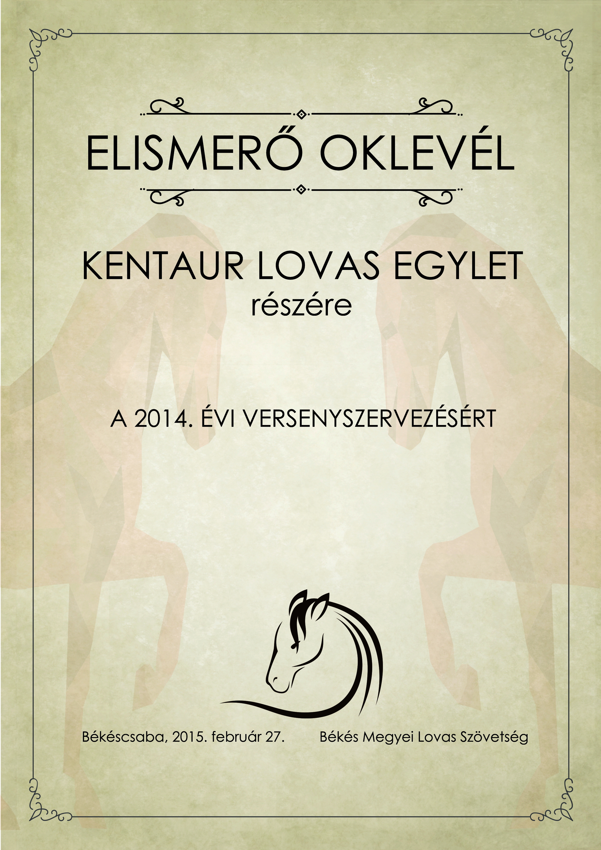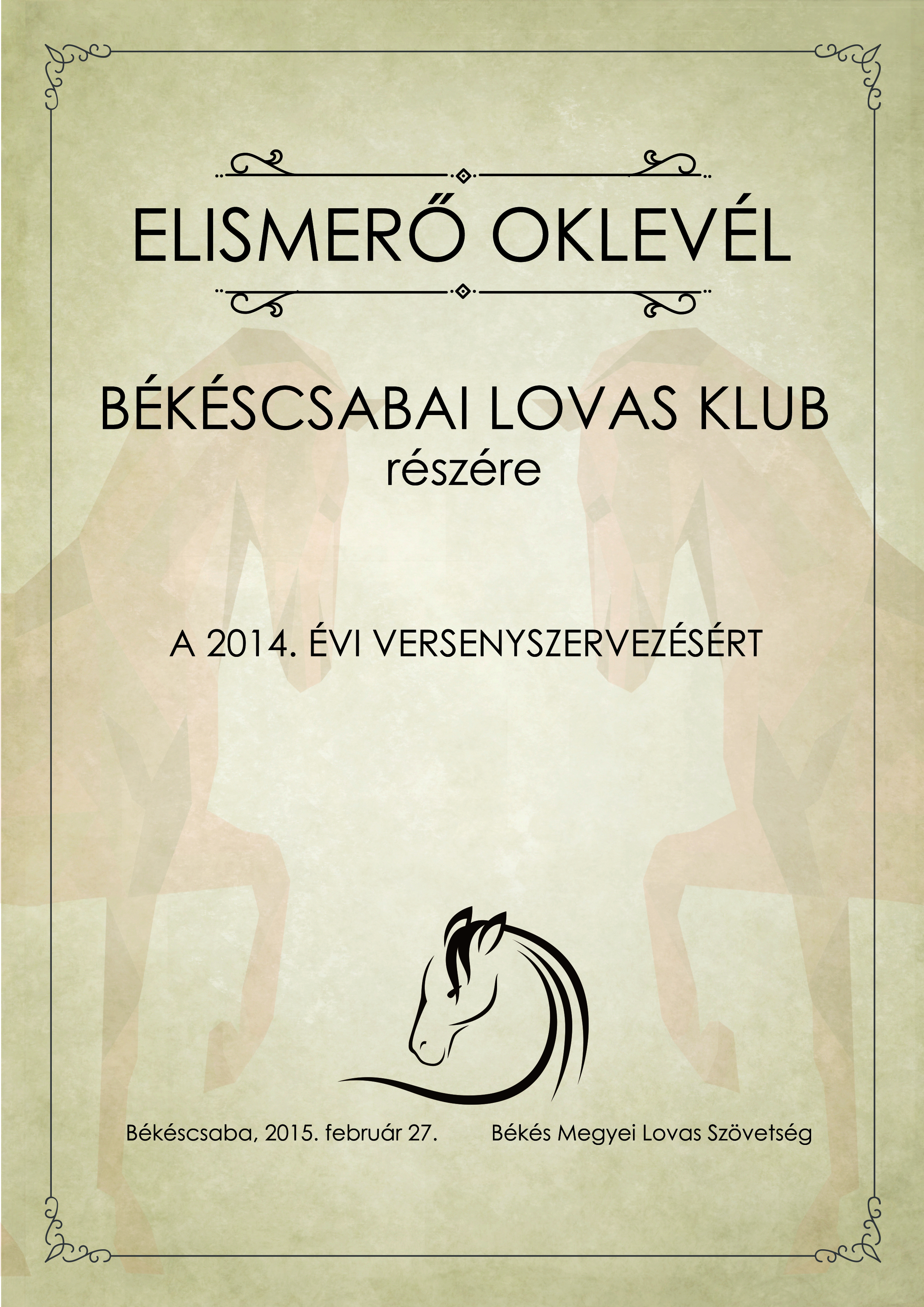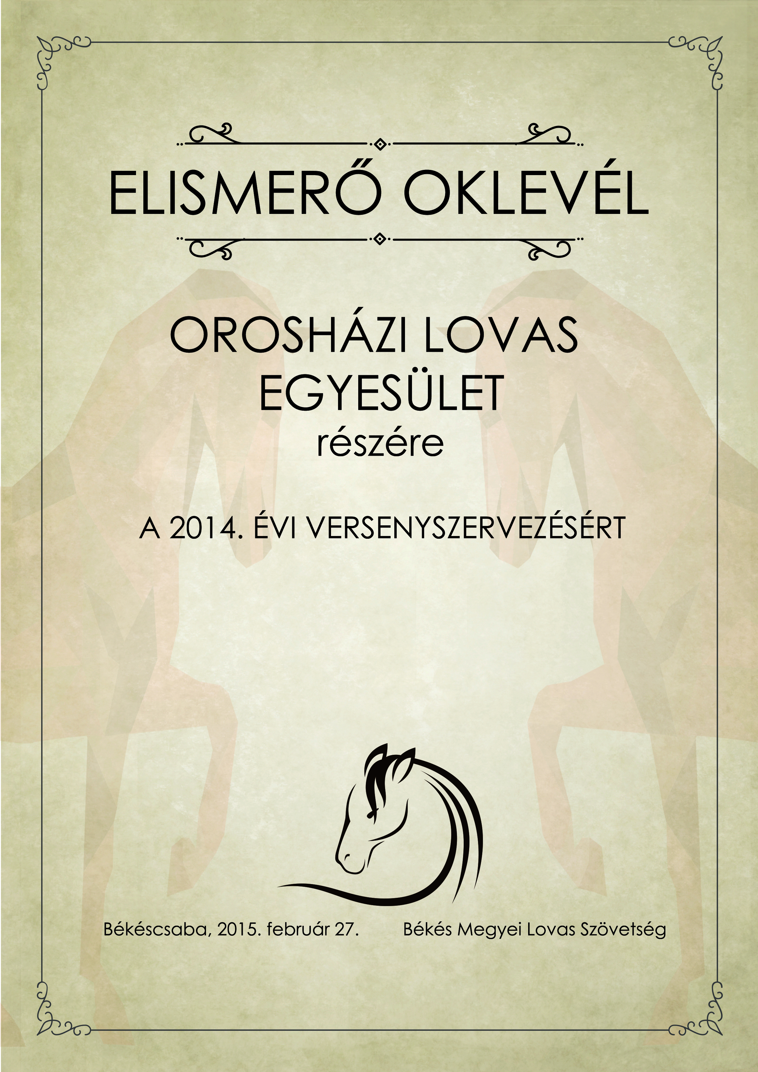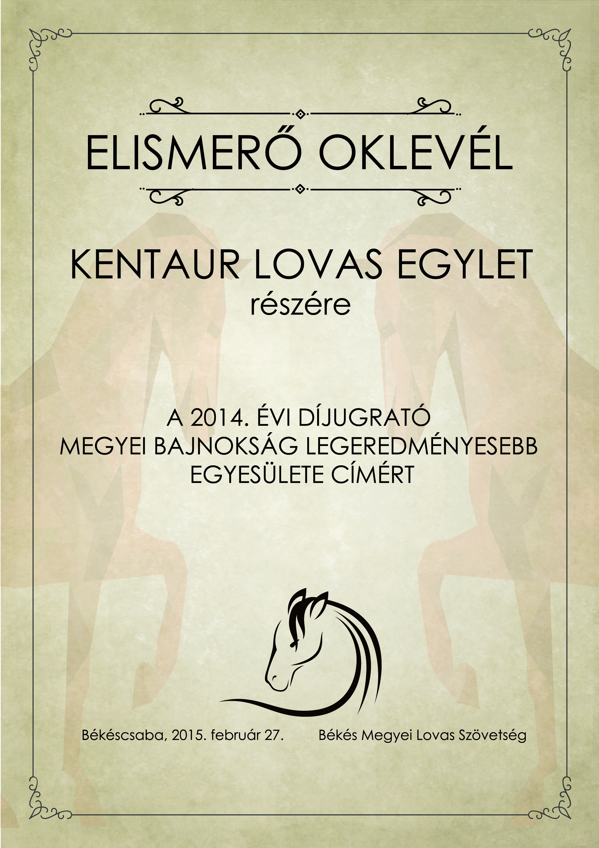 Oklevéllel jutalmaztuk a 2014-es év országos versenyein eredményesen szereplő tizenhat lovast: Jován Richárd, Piroska Zoltán, Krucsó Szabolcs, Szász Attila, Erdélyi Balázs, Domokos Tamara, Kotroczó Róbert, Fülöp Adrienn, Sánta Margit Borbála, Demkó Zsolt, Bata Boglárka, Bata Luca, Sztricskó Janka, Kulik Ferenc, Makoviczki Ákos, Mórocz Mercédesz. (Néhányan egyéb elfoglaltságuk miatt nem tudtak személyesen jelen lenni).