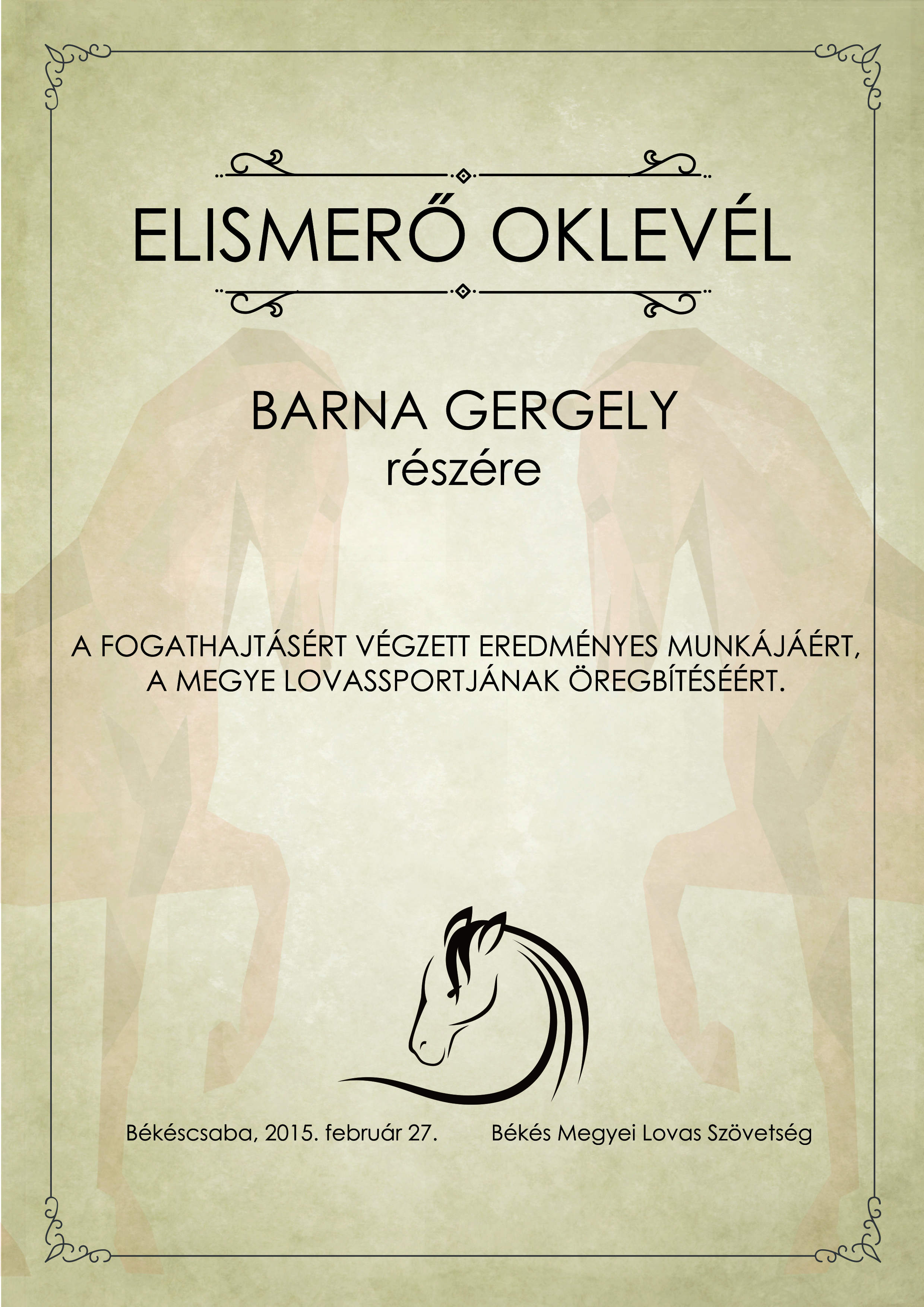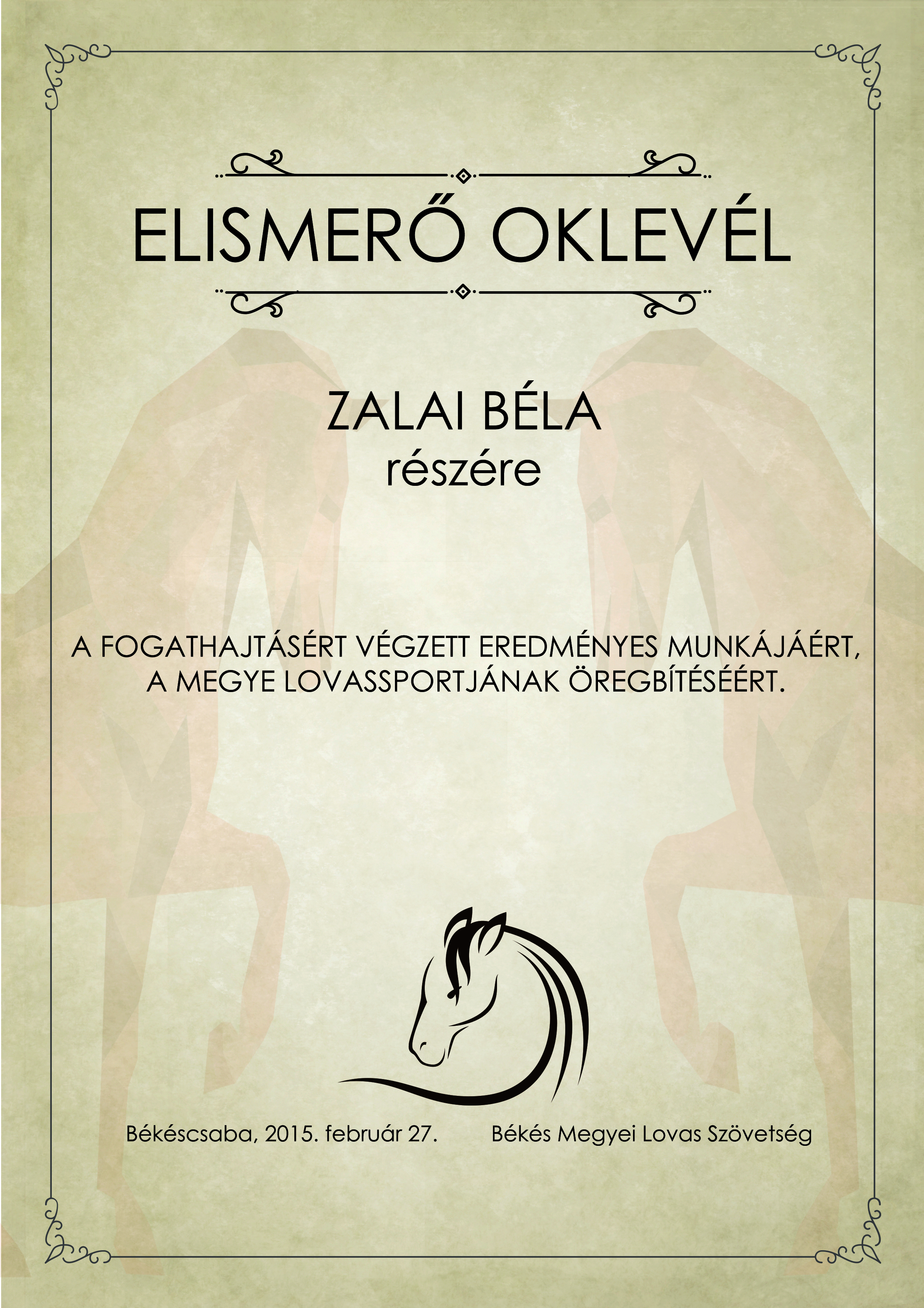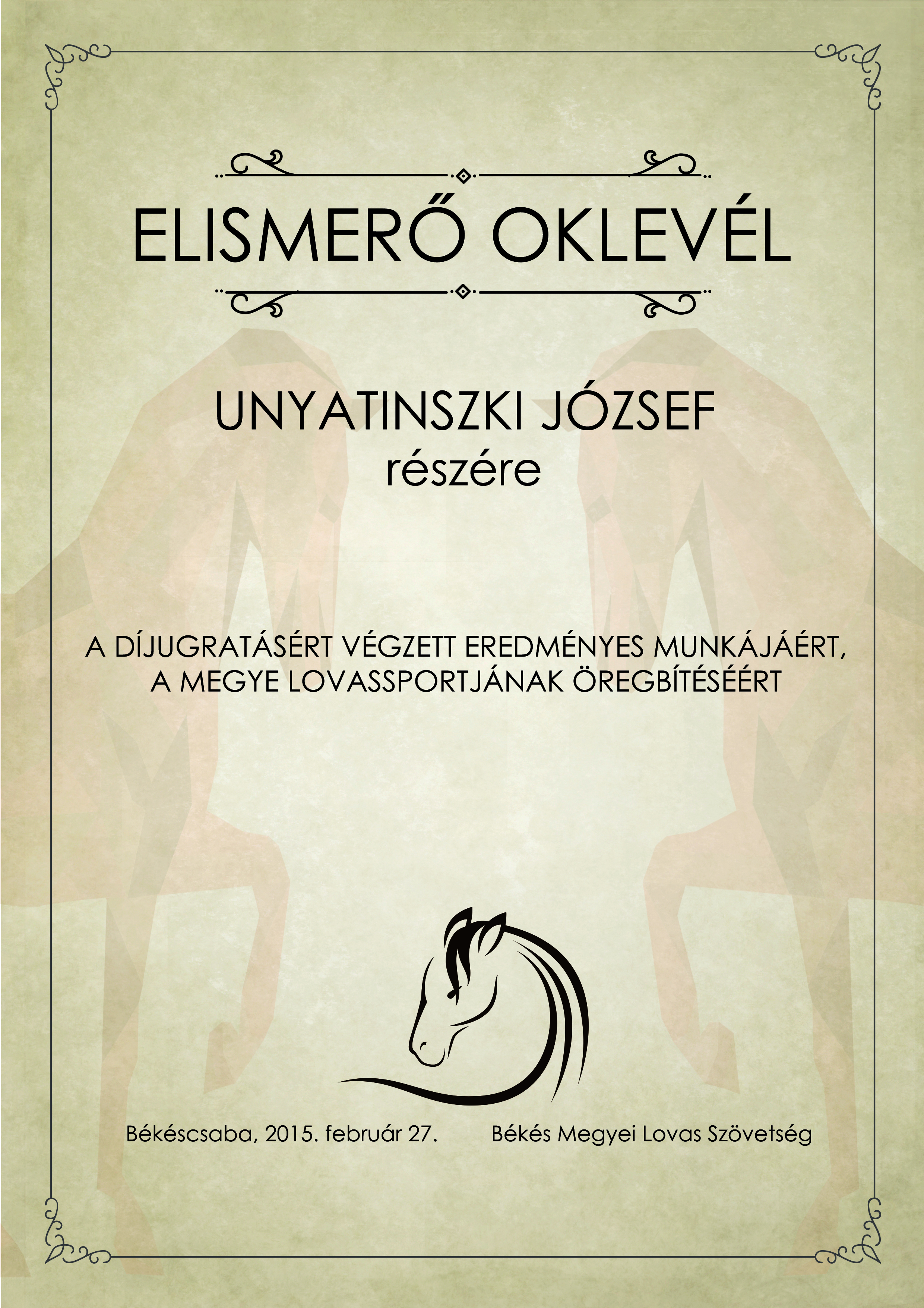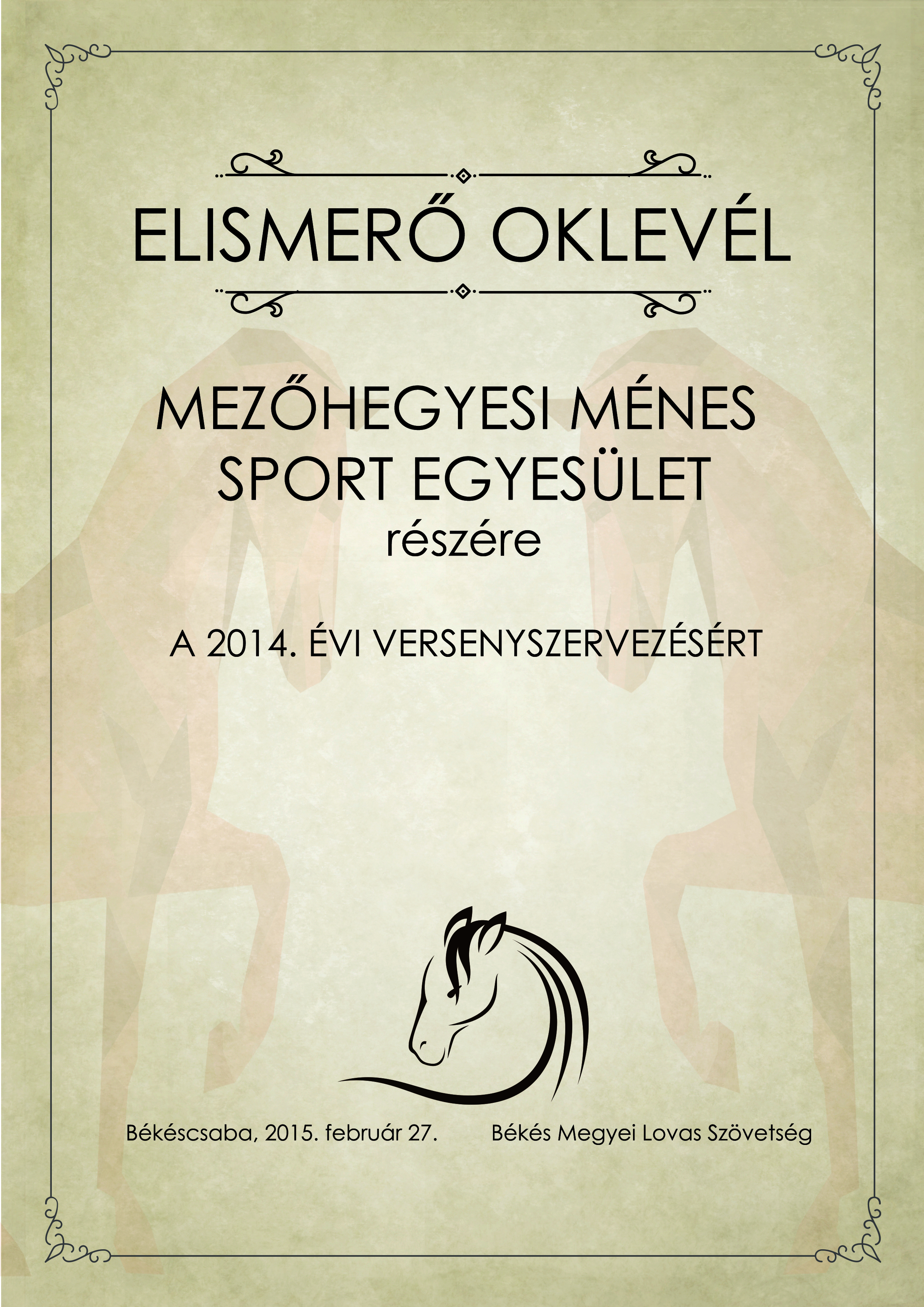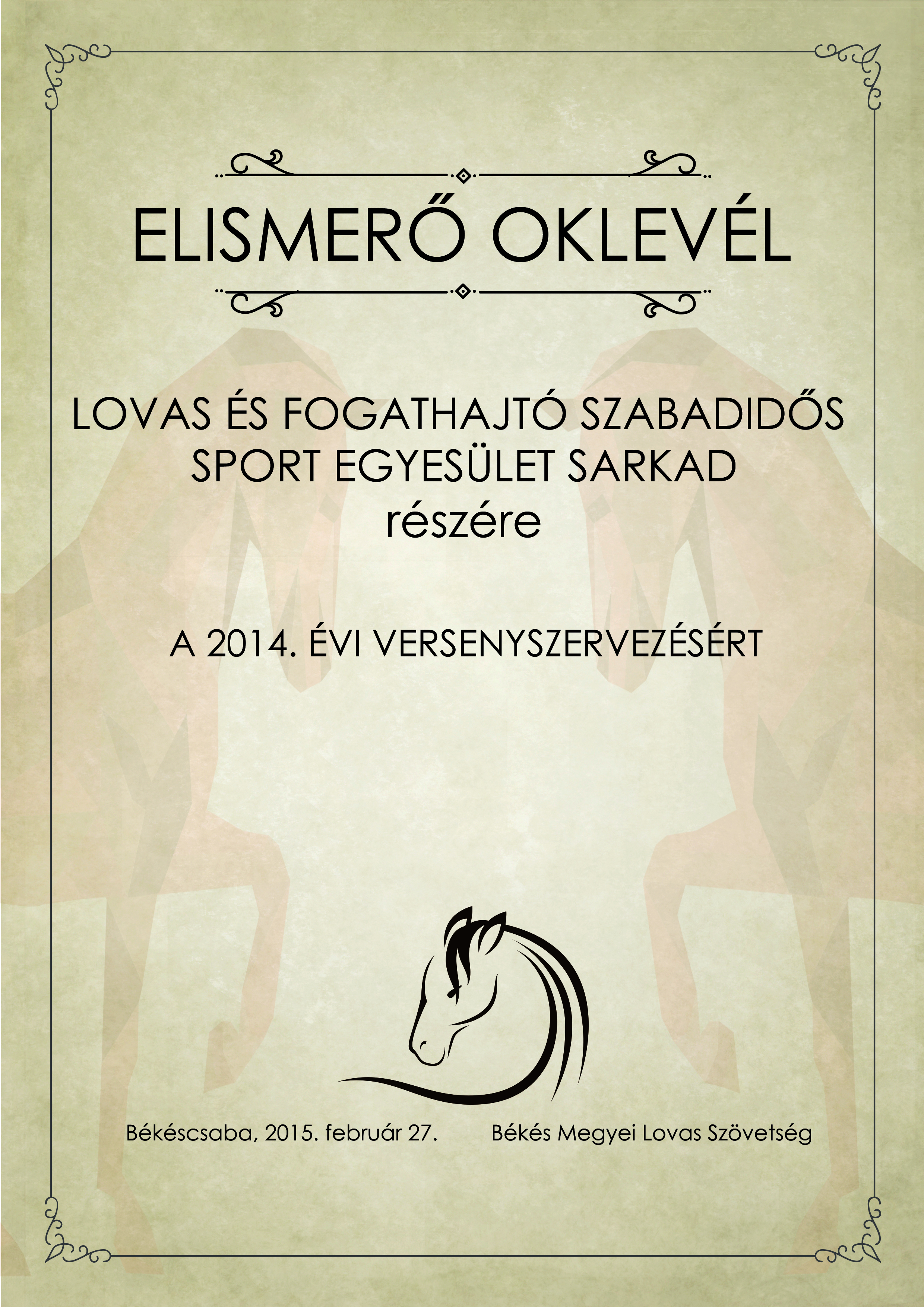Oklevéllel jutalmaztuk a 2014-es év országos versenyein eredményesen szereplő tizenhat lovast: Jován Richárd, Piroska Zoltán, Krucsó Szabolcs, Szász Attila, Erdélyi Balázs, Domokos Tamara, Kotroczó Róbert, Fülöp Adrienn, Sánta Margit Borbála, Demkó Zsolt, Bata Boglárka, Bata Luca, Sztricskó Janka, Kulik Ferenc, Makoviczki Ákos, Mórocz Mercédesz. (Néhányan egyéb elfoglaltságuk miatt nem tudtak személyesen jelen lenni).