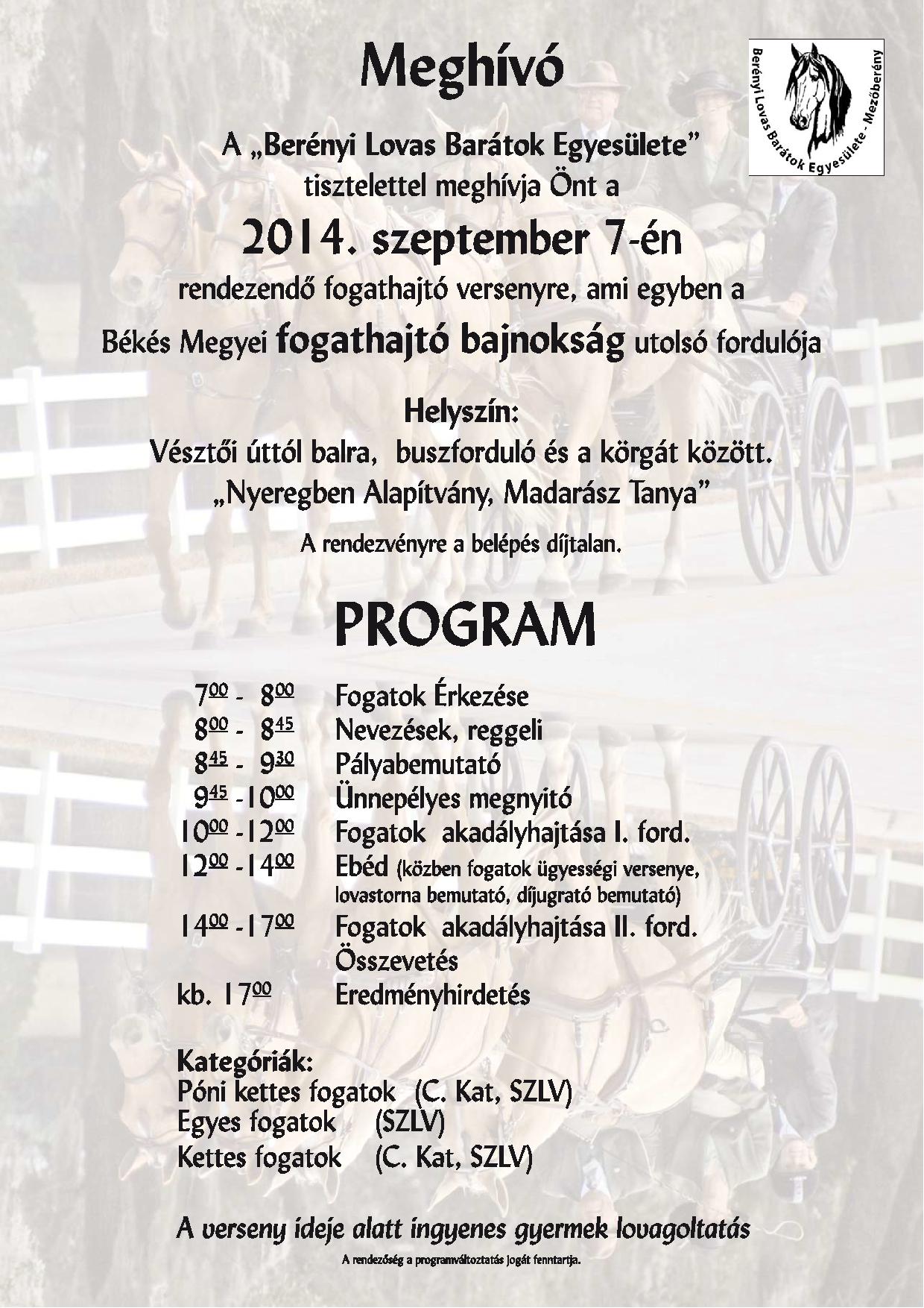 Bíró Zsolt A Berényi Lovas Barátok Egyesülete 2014. szeptember 7-én (vasárnap) fogathajtó versenyt rendez, ami egyben a Békés megyei fogathajtó bajnokság utolsó fordulója is.