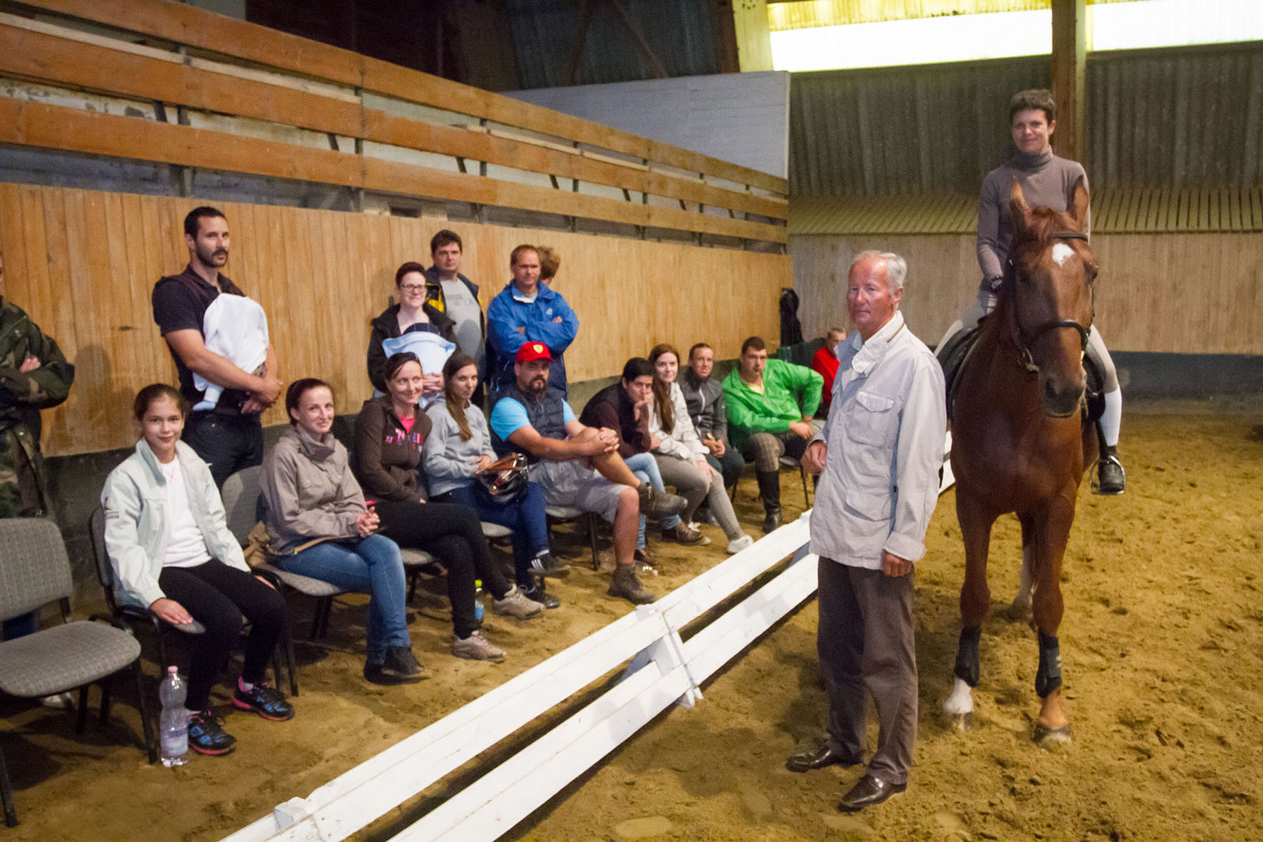 Dallos Gyula mesteredző, lovas tanár a díjlovaglás tudományát oktatja