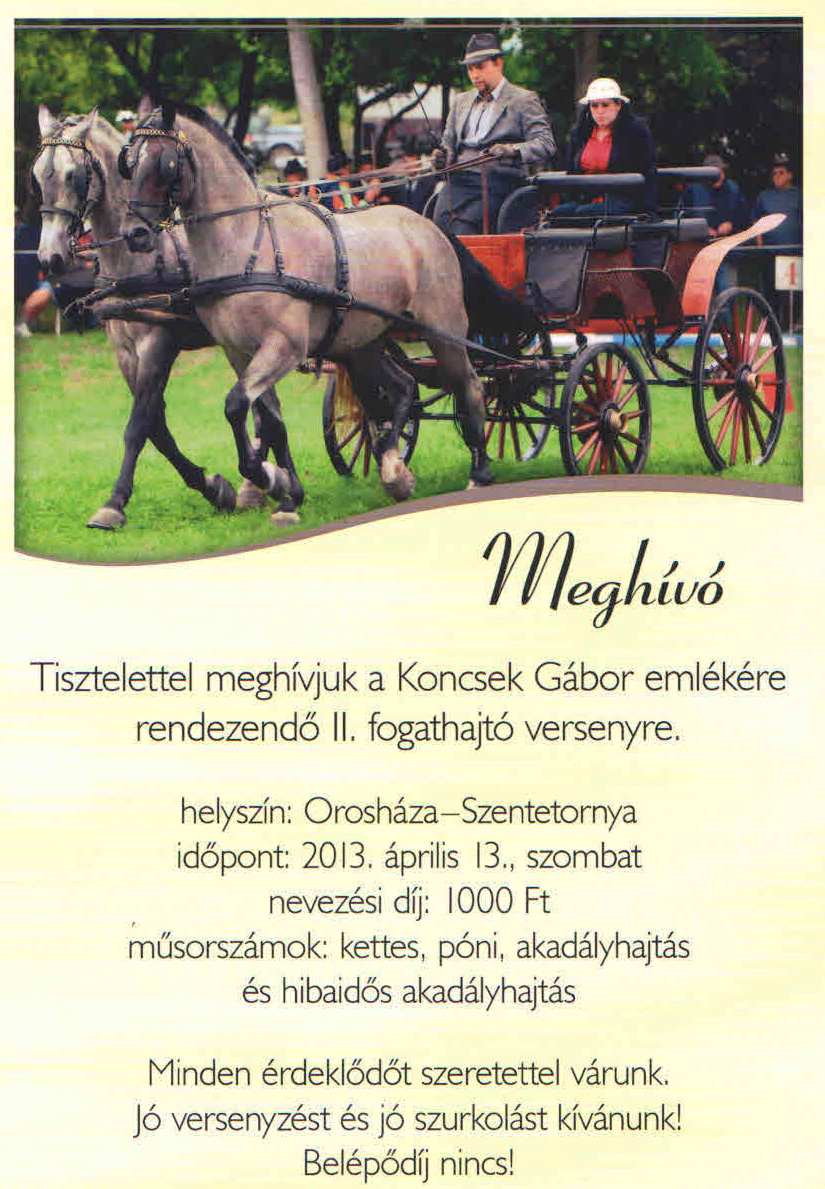 “Koncsek Gábor” emlékére Orosháza-Szentetornyán II. alkalommal kerül megrendezésre szabadidős fogathajtó verseny 2013. április 13-án szombaton.